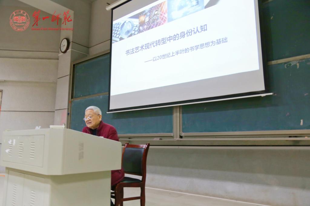 2018年11月16日晚,中国书法家协会顾问、中国艺术研究院、四川大学博士生导师胡抗美教授,应邀在润寰楼南106教室为我校中午字幕在线播放第一页书法学专业全体师生及书法爱好者进行了题为《书法现代转型中的身份认知》的学术讲座。
