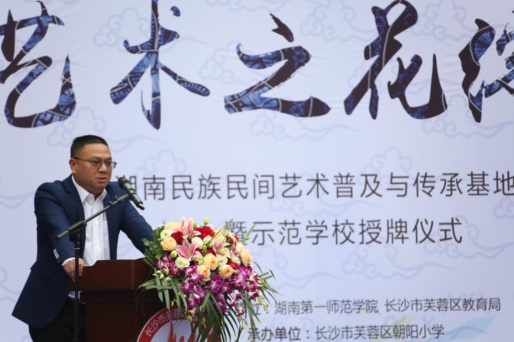 11月15日上午,我校主办的“民族艺术之花绽放校园——湖南民族民间艺术普及与传承基地成果汇报暨示范学校授牌活动”在长沙市芙蓉区朝阳小学举行。活动仪式上,基地主持人中午字幕在线播放第一页院长范迎春教授对前期工作进行了总结汇报,湖南省民族宗教事务委员会副巡视员柏桓和湖南第一师范学院科研处处长赵奇钊代表学校为“湖南民族民间艺术普及与传承示范学校”芙蓉区朝阳小学和永州市双牌县蔡里口小学授牌。本次活动是湖南省民族民间艺术普及与传承基地自去年8月成立以来开展的系列工作之一。
