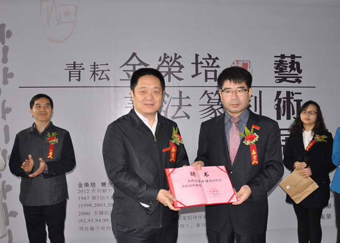 校长肖湘愚为金荣培先生颁发客座教授聘书,并宣布书法篆刻艺术展开幕。