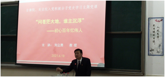 仪式结束后,学校档案与校史馆馆长刘立勇教授以“问苍茫大地,谁主沉浮——初心百年忆伟人”为题讲党课。课堂上,校史与党史相互辉映、个人与时势命途相关,杨昌济、徐特立、黎锦熙等仁人志士在第一师范心怀天下、为国育才的幕幕场景,毛泽东、蔡和森、何叔衡、萧子升、郭亮等革命先辈立志报国、矢志不渝、前赴后继的感人事迹,在“千年学府、百年师范”煌煌长卷里,在中共“一大”的燎原星火中徐徐展开,进一步坚定了学员们“学党史、感党恩、跟党走”的理想信念。