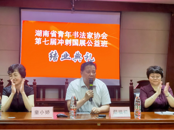 经过为期5天的培训,7月19日下午,湖南省青年书法家协会第七届冲刺国展公益培训班在全体公益班师生的参与和努力中圆满结业,结业典礼在特立楼南栋一楼思政实训室举行。中国书法家协会副主席、湖南省文联主席、湖南省书法家协会主席鄢福初、湖南第一师范学院校长童小娇、湖南第一师范学院纪委书记李昱、湖南第一师范学院党总支书记邹华秀、湖南省青年书法家协会主席梁理,副主席兼公益班班主任陈毅华,以及部分公益班授课教师、助教和百余位学员共同参加了结业典礼。