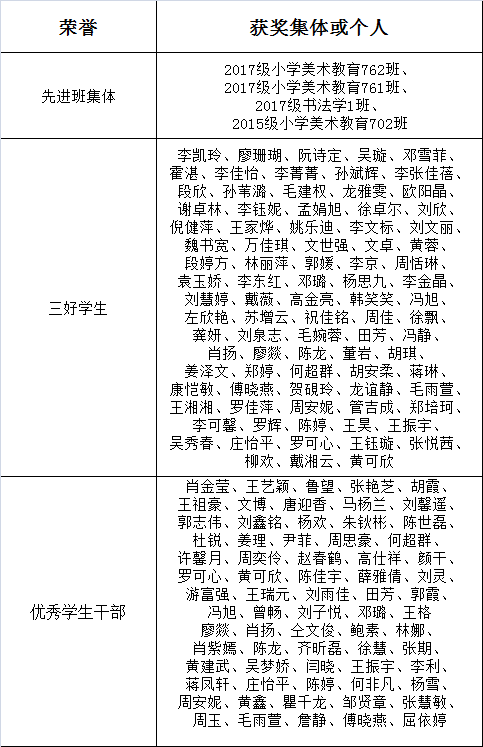 关于2017-2018学年度先进班集体、三好学生、优秀学生干部评选结果的公示 发布时间:2018-11-15 作者: 浏览次数: 根据学校《关于评定2017—2018学年度先进班集体、三好学生、优秀学生干部的通知》的相关文件精神,本着“公平、公正、公开”和优中选优的原则,经各班推荐,院学工办审核,院评审委员会严格评审,最后拟推荐以下班集体为校级先进班集体,以下学生为三好学生、优秀学生干部: 特此公示,公示日期为2018年11月15日—18日.公示期间,接受实名来电来访,过期不予受理。 受理办公室美术楼:213、215、223 受理电话:88235431、88235429 中午字幕在线播放第一页学工办 2018年9月15日