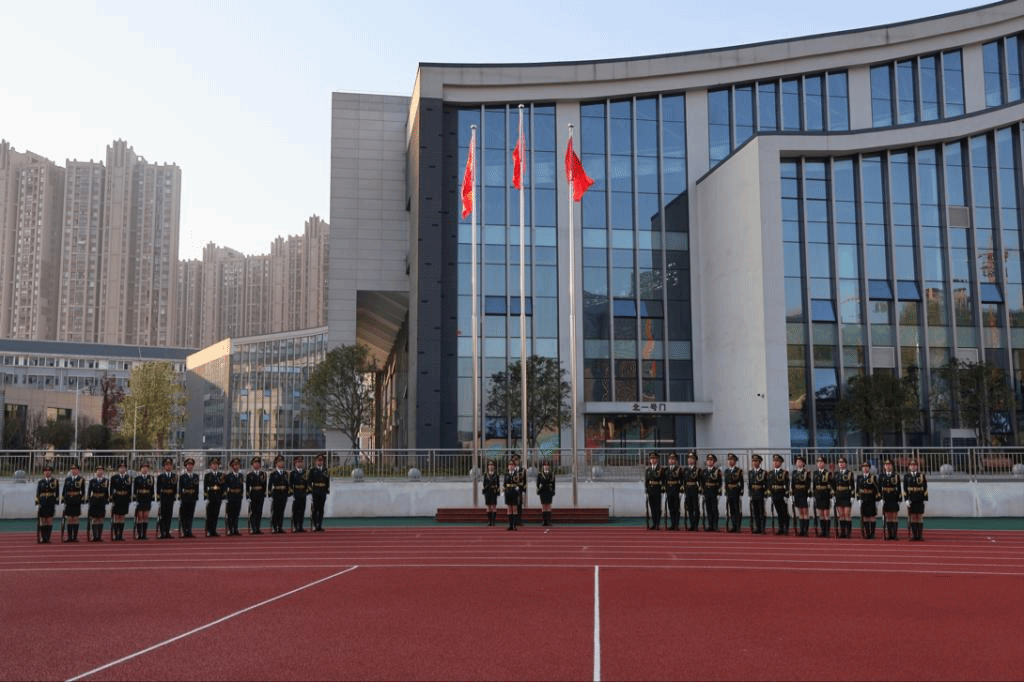 校国旗护卫队迈着整齐划一、铿锵有力的步伐,护送五星红旗入场,伴随着庄严的国歌声,鲜艳的五星红旗缓缓升起,全体师生肃立致敬,晨光中五星红旗迎风飘扬。