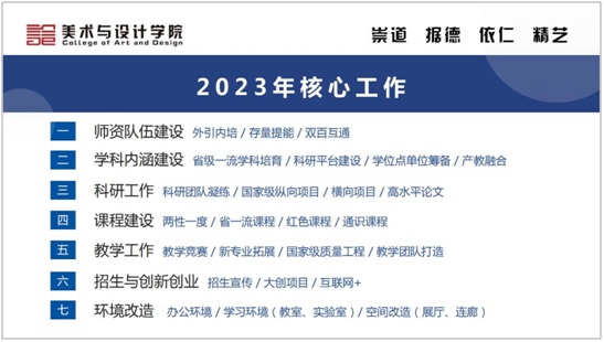 首先,蔡惠萌副院长(主持行政工作)汇报了美设院“两性一度”课程建设落实情况与2023年教学核心工作重点。关于“两性一度”课程建设,学院通过优秀课例示范引领、专家指导、督导督查、金课评审等一系列措施积极落地“两性一度”课程建设,目前已建成20门线上课程,后续将继续完善课程建设,另有12门线上课程预计于今年年底逐步建成。2023年学院的教学核心工作将持续抓实“两性一度”金课建设,做好红色课程与通识课程,推动教育教学改革;加强师资队伍建设,实施教师“存量提能”,持续推进学科专业内涵建设,推动产教融合,凝练学科方向,凸显专业特色;加大教学与科研团队建设力度,培育国家级和省部级教研成果,教研结合,不断拓展省级科研教学平台与教学质量工程,切实提高人才培养质量。