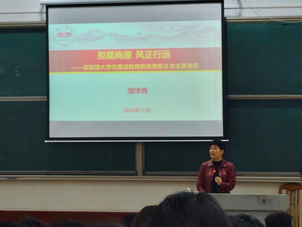 开班仪式结束后,音乐与舞蹈学院党委书记邹华秀作主题为“拒腐尚廉身正行远——谈加强大学生廉洁教育的重要意义与主要途径”的讲座。廉洁修身,是对大学生的政治期待、道德希望,更是处在中国特色社会主义新时代的大学生应担负的历史责任。邹书记分析了廉洁教育的重要意义、实现廉洁自律的主要途径,呼吁大学生做好个人修身,为实现中华民族伟大复兴的中国梦贡献廉洁的青春力量。