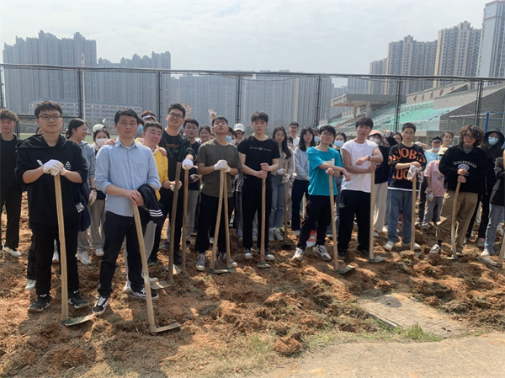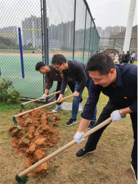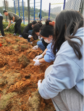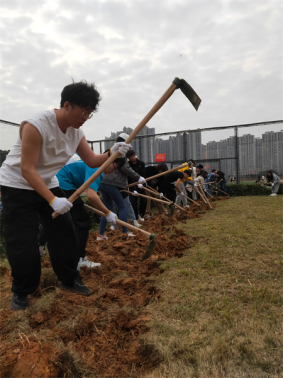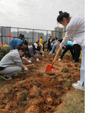 在植树节活动现场,最吸引人眼球的是我院的学生志愿者们,我们没有采取其他院的分块承包办法,而是齐心协力、集体作战,一排男生在前挖土翻地,一排女生在后除杂草草根,成为活动现场最靓丽的风景线。