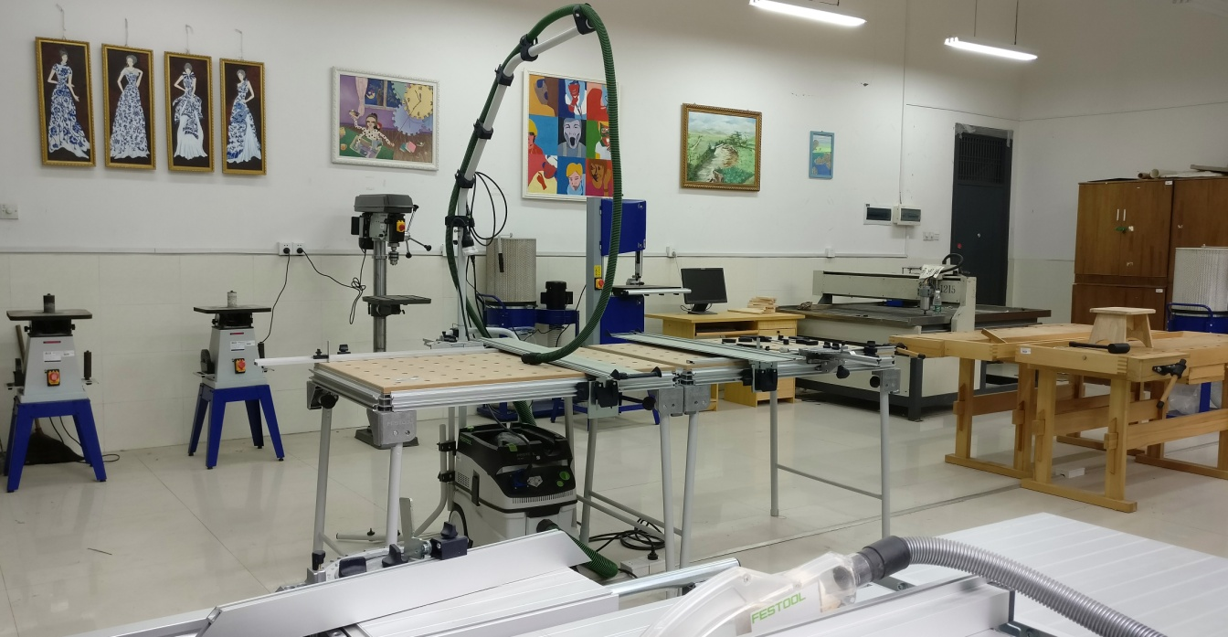 装饰工艺教学实训室成立于2012年,隶属于艺术设计实验实训中心。目前,实训室设置于美术楼107室,使用面积约115平方米,实训仪器设备80余台套,资产总额31.1万余元。主要大型仪器设备有:金属雕刻机、电动扳手、电剪刀、电圆锯、电动刨、电动刻刀、三艺画架、电脑等。主要承担视觉传达设计和美术学专业学生的装饰画等课程的实训教学任务,年均承担3980实训人时数。