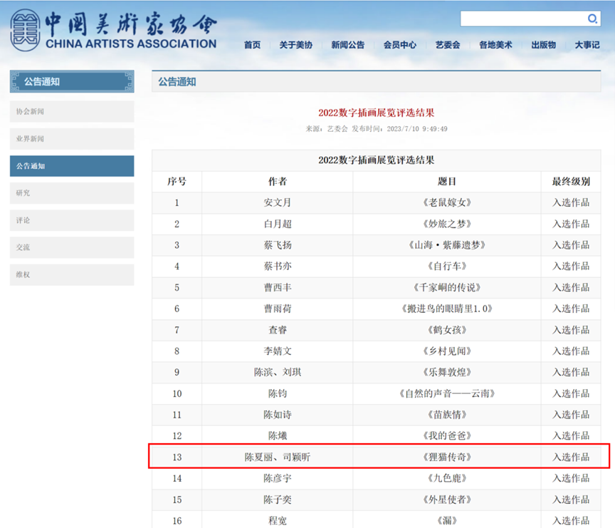 近日,美设院美术学系师生陈夏丽和司颖昕作品《狸猫传奇》入选由中国美术家协会主办的“2022数字插画展”。据悉此次展览投稿作品达到上千件,最终仅169组作品入选。